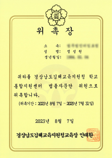 - 현) 김해시교육지원청 법률고문단 · 진해경찰서 안보자문의원