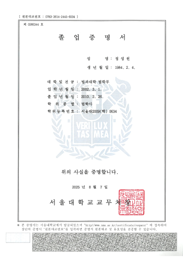 - 경북대학교 법학전문석사(J.D. 졸업)