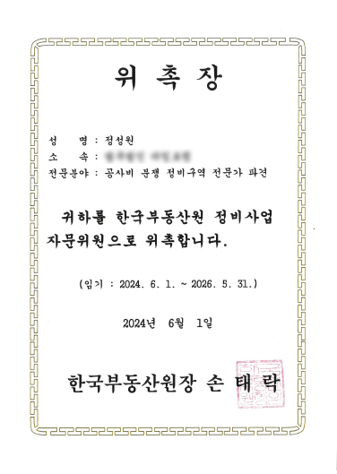 - 현) 한국부동산원 공사비분쟁·조합운영 전문가 위원